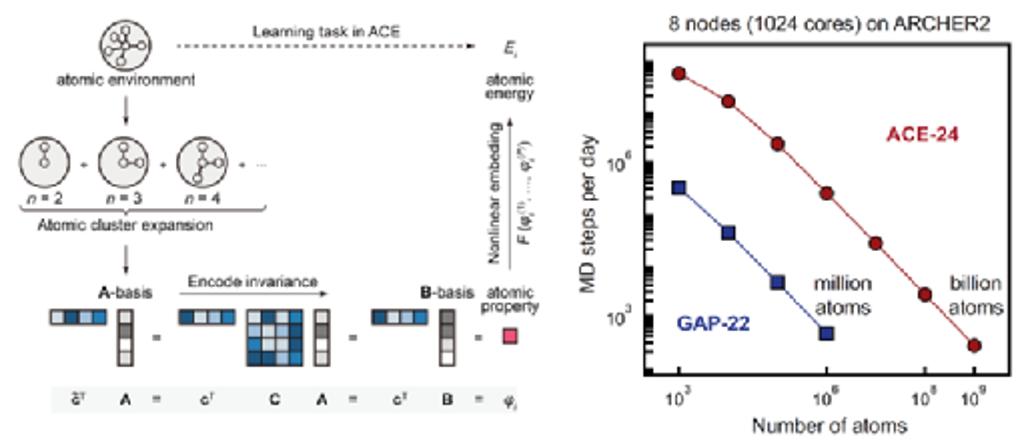 为攻克这一难题,西安交通大学金属材料强度全国重点实验室材料创新设计中心(CAID)与牛津大学研究人员开展合作,开发了一种基于“原子簇扩展”(Atomic Cluster Expansion, ACE)框架的超快机器学习势函数。该工作建立在团队前期开发的GST-GAP机器学习势函数的基础之上Nature Electronics 2023, 6, 746–754),通过引入ACE框架和额外的领域特定数据集迭代流程,使得新的GST-ACE势函数在不损失原子受力与运动精度的前提下,将模拟效率进一步提升,达到GST-GAP的400多倍,可支撑百万原子纳秒级或十亿原子皮秒级的分子动力学模拟。