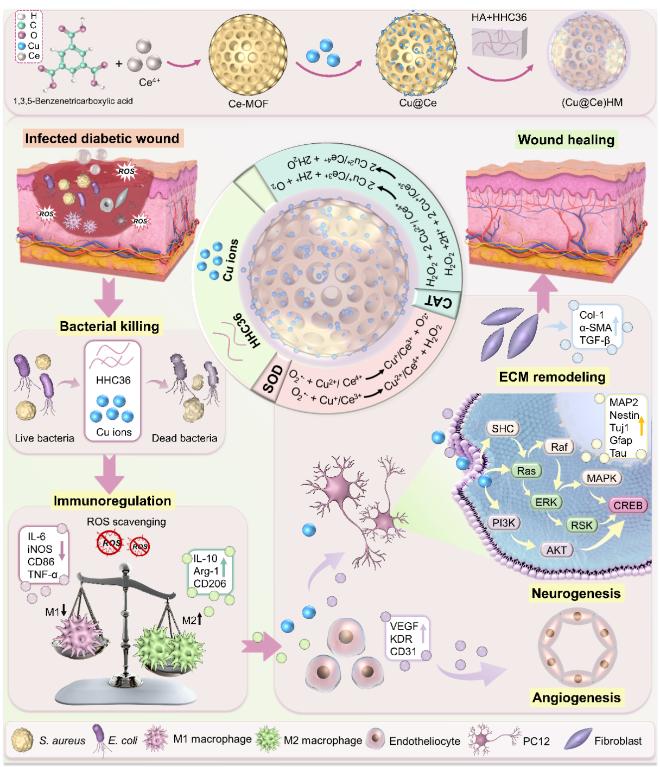 针对上述问题,近日,西安交通大学金属材料强度全国重点实验室的研究人员构建了一种核壳型双金属纳米酶((Cu@Ce)HM),其内核为铜键合的铈基金属有机框架(Cu@Ce-MOF),外壳为负载抗菌肽HHC36的透明质酸(HA)。在感染的糖尿病微环境中,(Cu@Ce)HM 可响应性释放铜离子与HHC36,二者协同发挥优异的广谱抗菌作用,对金黄色葡萄球菌和大肠杆菌的抗菌率分别达到97.01%和99.55%。铜的键合引起Ce-MOF内部电子重排,形成Cu⁺/Cu²⁺与Ce³⁺/Ce⁴⁺氧化还原对,进而增强其模拟超氧化物歧化酶(SOD)和过氧化氢酶(CAT)的活性,有效清除活性氧(ROS),改善糖尿病病理微环境。微环境的改善与低剂量铜离子共同促进巨噬细胞由M1型向M2型转化,增强抗炎细胞因子的分泌,从而进一步提升内皮细胞(HUVECs)、神经细胞(PC12)和成纤维细胞(L929)的生物学功能,促进伤口部位的血管神经再生及细胞外基质重塑。转录组测序分析显示,(Cu@Ce)HM 通过其抗氧化特性与铜补充作用,上调关键信号通路—包括PI3K/Akt/CREB、Ras/ERK/CREB和Ras/ERK/MAPK,从而促进受损PC12细胞的修复与分化。