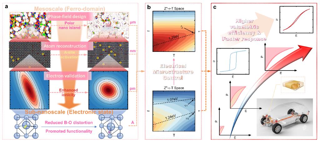 图1. 用于高效介电储能的多极序工程策略。a) 基于相场模拟的性能优化,涵盖畴结构(极性纳米区)、原子构型(B位位移矢量)、电子极化(亚埃级电子云位移)和晶体结构(调制畸变)。b) 通过化学调控(弛豫时间统一)重构电学微结构。c) 实现了高体积效率和快速响应速度,适用于下一代电动汽车电力电子器件。