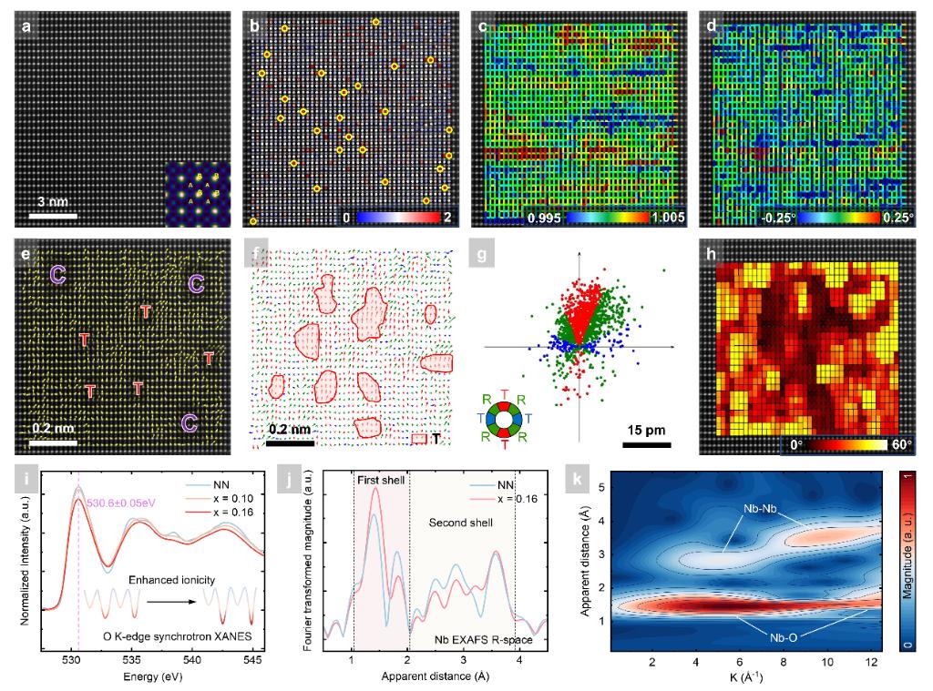 通过同步辐射X射线吸收谱(XAS)与高角环形暗场扫描透射电镜(HAADF-STEM),研究团队首次在介电材料中观测到亚埃级电子云位移,并证明其通过增强Nb–O键离子性、均匀化键长分布,显著提升了极化切换速度与储能效率。
